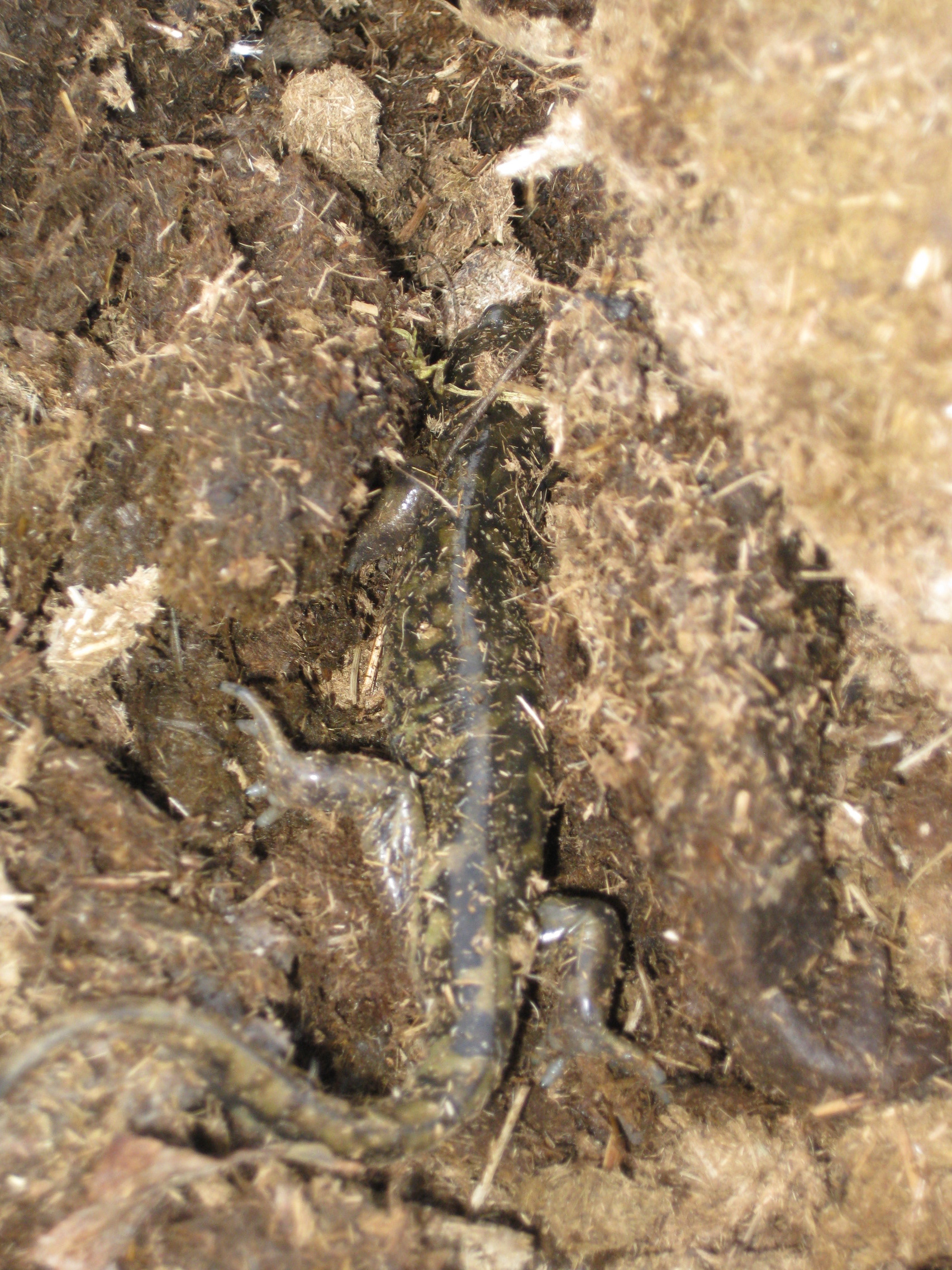 But the most biologically diverse compost is the cow manure. I picked the cow manure up from the pastures (yes, I felt very peasant-like doing this) so we’re not talking cow manure/feedlot slurry here, we’re talking about a dried, almost peat-like cow manure that’s been self-composting out in the fields for a year. There are lots of larvae of various insects living in it, and a tiger salamander! It didn’t like having it’s photo taken very much, but here it is.